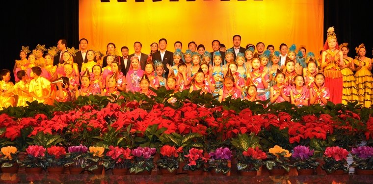 觀看演出的縣四大組織領(lǐng)導(dǎo)與全體演職人員合影