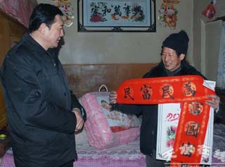 在城關(guān)鎮(zhèn)陳門村,武建成見到了當年隨志愿軍奔赴抗美援朝前線的老復員軍人魏國忠。他深情的握著魏國忠的手說:“感謝您早年為革命事業(yè)做出的貢獻,縣委、縣政府不會忘記您,人民不會忘記您。希望您老好好保重身體,享受現(xiàn)在的幸福生活!蔽簢乙晃吨轮x黨和政府對他的關(guān)懷。