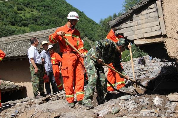 26日夜,龍臺(tái)鄉(xiāng)請(qǐng)求救援。27日一早,縣委副書記、縣長(zhǎng)索鴻賓帶領(lǐng)10名消防隊(duì)員趕赴龍臺(tái)鄉(xiāng)青山村進(jìn)行救援。暴雨過后,到處是塌方、道路下陷,經(jīng)過搶修的道路仍然危險(xiǎn)重重,再經(jīng)過2個(gè)小時(shí)的艱苦行程后,大隊(duì)人員順利到達(dá)龍臺(tái)鄉(xiāng)政府。在現(xiàn)場(chǎng)指導(dǎo)工作的縣委副書記、縣長(zhǎng)索鴻賓直接對(duì)消防大隊(duì)下達(dá)命令,開赴受災(zāi)最重的青山村進(jìn)行搶修道路、修筑河堤、搭建帳篷。當(dāng)天,天空中不時(shí)飄下細(xì)雨,在現(xiàn)場(chǎng)救援的長(zhǎng)時(shí)間作業(yè)的隊(duì)員衣服被雨水漸漸打濕,但仍然堅(jiān)持奮戰(zhàn)在一線,盡管少吃少喝,但盡頭一點(diǎn)不減,直至下午四時(shí)許,才吃上了午飯,這種精神深深地感動(dòng)了鄉(xiāng)政府的干部和當(dāng)?shù)卮迕,都為消防?duì)員豎起了大拇指。