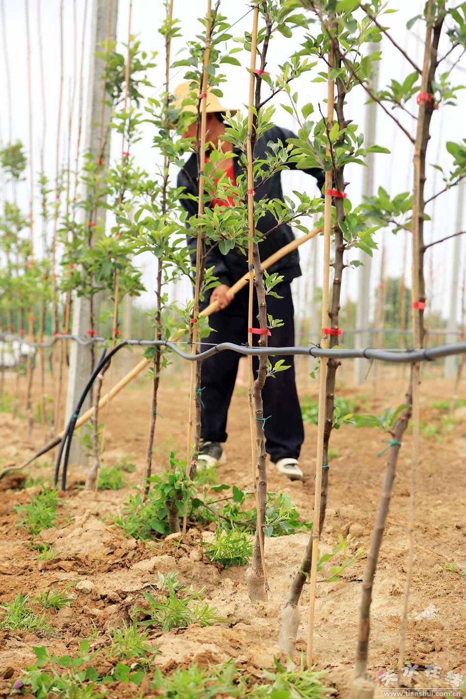 (圖為果農(nóng)在武山縣洛門牟坪現(xiàn)代農(nóng)業(yè)蘋果矮化密植示范園鋤草)