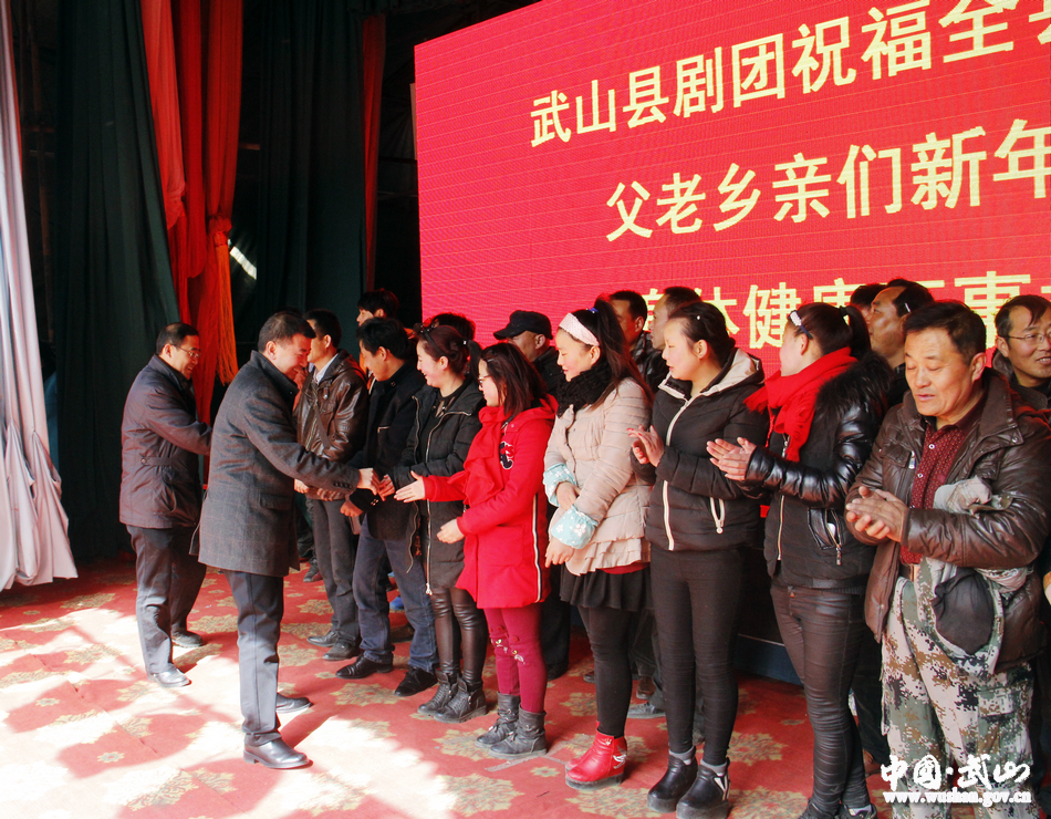 。ǹh領(lǐng)導張仲牛 甘志國看望慰問演出人員并與他們親切握手)