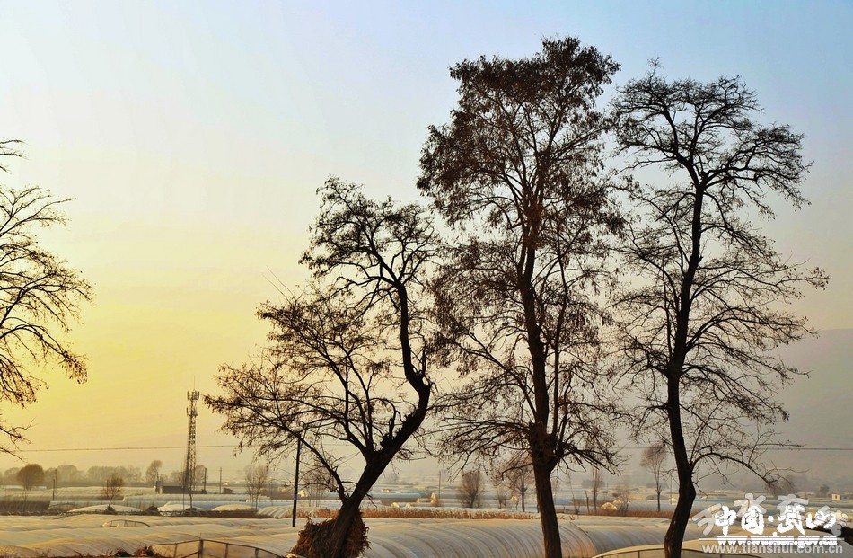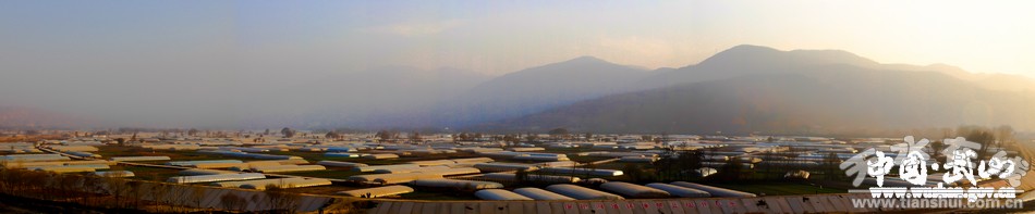 冬日的武山,在廣袤的川道地區(qū),一望無際的蔬菜塑料大棚錯落有致,為無雪的大地添上一道道美麗的風情線。太陽落山前,晚霞為冬暖棚涂上一抹抹橘紅的衣裳,如詩!如畫。ㄎ/圖 薛耀忠)