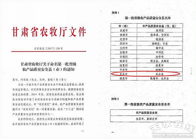 5月9日,在慶陽西峰召開的全省農(nóng)產(chǎn)品質(zhì)量安全監(jiān)管工作會(huì)議上,武山縣被命名為省級(jí)農(nóng)產(chǎn)品質(zhì)量安全縣。