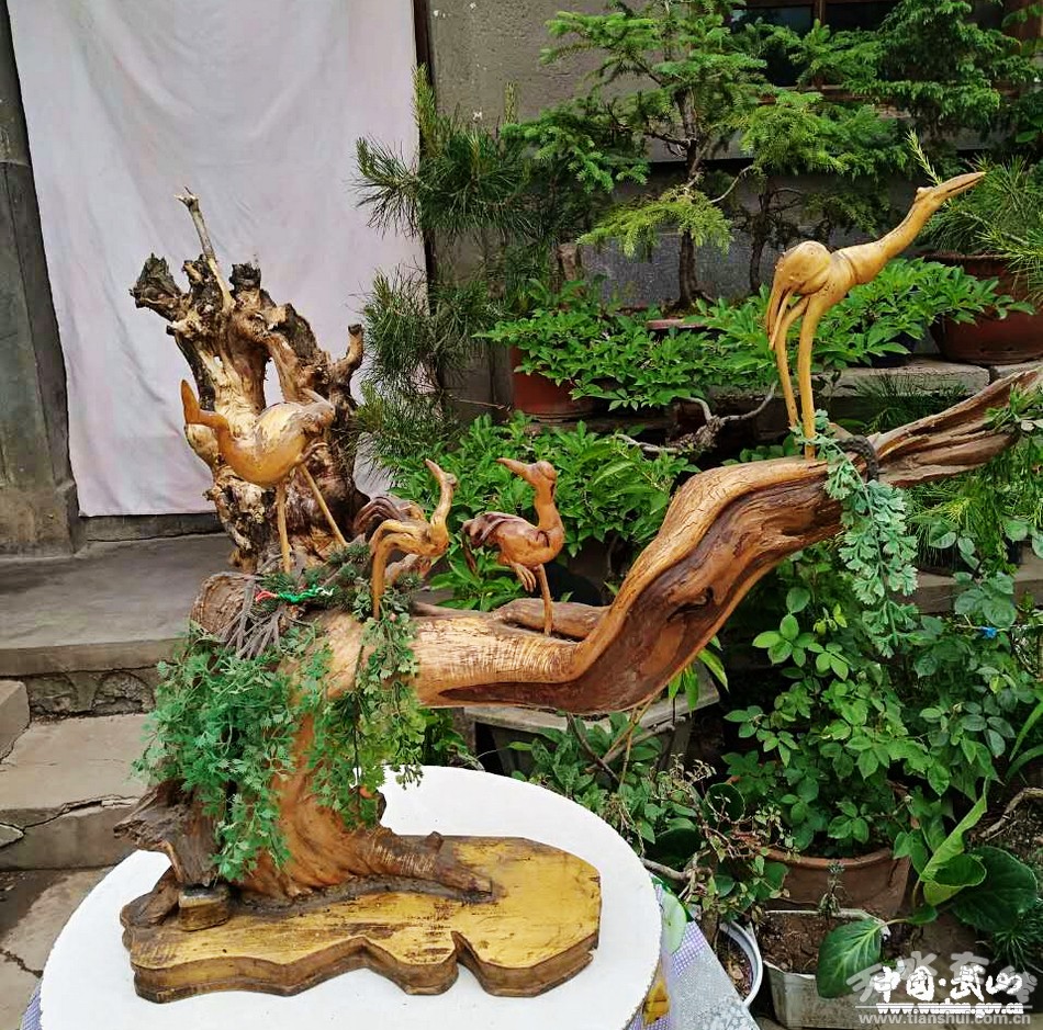 武山淳樸、務實、不尚浮華的民風,給當?shù)馗袼囆g以深刻的影響。多數(shù)根雕創(chuàng)作依樹根的自然形態(tài)、天然紋理來展開想象,進行藝術加工創(chuàng)作,以展示跟木自身的藝術魅力,有“清水出芙蓉,天然去雕飾”的自然之美。野葡萄、黃楊木、青楓等都是制作根雕的良好材料,也是當?shù)厣种械膶こ浞N。還有香柏,不但氣味清香四溢,而且根系發(fā)達,形狀千奇百怪,極適宜根雕。香柏抗嚴寒、耐貧瘠,不擇地域生長,多扎根于懸崖峭壁間。這種木材油性大、木質(zhì)硬、耐腐蝕,色澤紅潤,愈枯愈紅,香氣四溢。虬枝盤旋彎曲,紋理鮮明美觀,這種耐嚴暑于高山,吐芳香于人間的超凡脫俗的品格,香柏所蘊含的意象造型潛力和獨特的審美價值,使它成為根雕藝術家的寵兒。