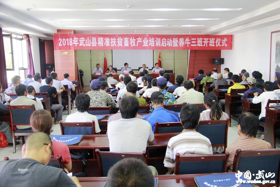 為認(rèn)真貫徹落實(shí)甘肅省農(nóng)牧廳《關(guān)于認(rèn)真落實(shí)到戶產(chǎn)業(yè)扶持政策切實(shí)做好到戶產(chǎn)業(yè)扶貧工作的通知》精神,進(jìn)一步提高全縣建檔立卡貧困戶產(chǎn)業(yè)發(fā)展水平,為按期順利實(shí)現(xiàn)全縣整體脫貧摘帽,堅(jiān)決打贏脫貧攻堅(jiān)戰(zhàn)提供堅(jiān)強(qiáng)支撐,8月6日上午,武山縣精準(zhǔn)扶貧畜牧業(yè)產(chǎn)業(yè)培訓(xùn)啟動暨養(yǎng)牛三班開班儀式順利舉行?h畜牧獸醫(yī)局、縣扶貧開發(fā)辦相關(guān)負(fù)責(zé)人,各鄉(xiāng)鎮(zhèn)畜牧中心負(fù)責(zé)人及業(yè)務(wù)骨干,參加養(yǎng)牛培訓(xùn)班的建檔立卡貧困戶共計110人參加開班儀式。