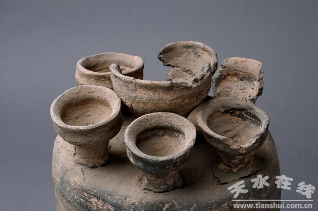 這件灰陶聯(lián)盞的胎質(zhì)成泥質(zhì)灰陶,制成方式為泥條盤筑法,頂部小盞杯為用手捏制,它向世人表明了當(dāng)時的制陶工藝和水平。其形狀表明了當(dāng)時游牧民族/古代羌人使用的照明燈具的樣子和質(zhì)地。頂部的七個小盞杯的分布情況,揭示了當(dāng)時人們對天空中的北斗七星的崇拜及信仰。(武山縣博物館 張志理 李君莉)