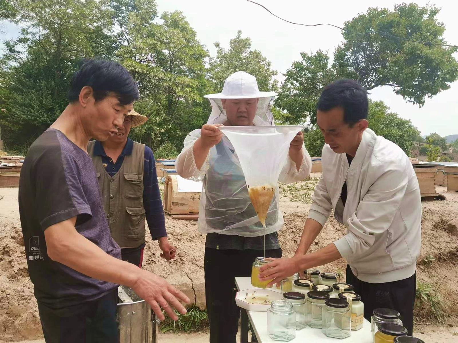 端午前夕,海拔1900米的武山縣山丹鎮(zhèn)明山村的一個(gè)院落內(nèi),由駐村幫扶隊(duì)員、村干部、群眾組成的養(yǎng)蜂團(tuán)隊(duì)正在打蜜。隨著蜂蜜裝瓶密封好貼上商標(biāo),在蜜蜂“嗡嗡嗡”聲的喝彩下,明山村今年的“甜蜜”事業(yè)大功告成。