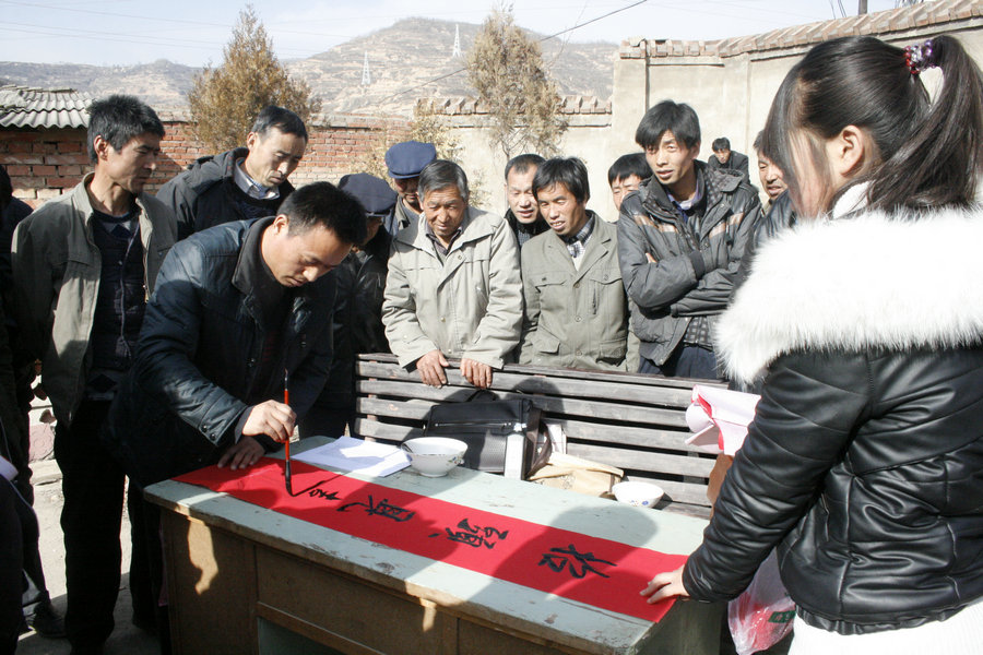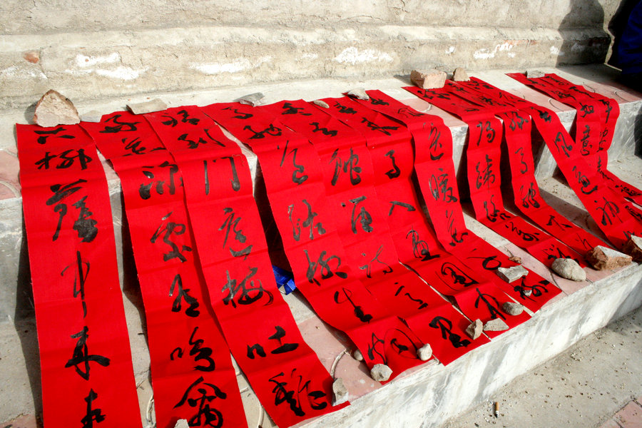“過大年,貼春聯(lián)”是中華民族的傳統(tǒng),是象征吉祥、表達(dá)人們向往美好生活的民族風(fēng)俗。在張家川縣2014年迎新春“送戲下鄉(xiāng)”活動現(xiàn)場,最耀眼的要數(shù)“寫春聯(lián)、送春聯(lián)”了,縣書畫家身邊圍滿了農(nóng)民群眾,他們有的幫著按紙,有的在排隊等待著,眼中充滿了期待和喜悅!爸袊,中國印,中國結(jié),中國夢,心心相印結(jié)成夢、百年轍,百年辛,百年贏,百年情,轍轍艱辛贏在情”、“美麗中國夢,文明幸福家”、“聯(lián)村聯(lián)戶連民心、為民富民真惠民 ”,一幅幅吉祥喜慶、墨寶飄香的春聯(lián)既寫出了農(nóng)民群眾對新年的喜悅,也描繪大家對更加美好生活的憧憬和期待。來自我縣的書法家,現(xiàn)場揮毫潑墨,為百姓書寫了近300幅春聯(lián)。紅紅的紙、紅紅的對聯(lián),映紅了村民的心,也映紅了紅紅的日子。