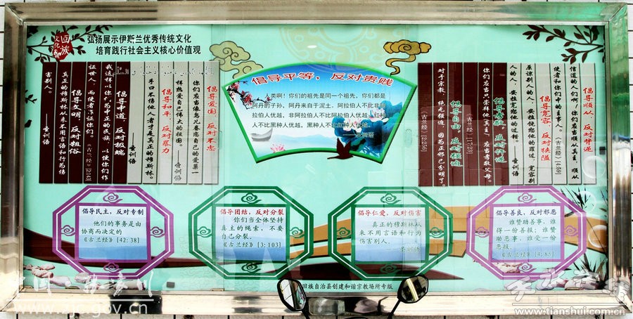 近年來,張家川縣清真西大寺、中街清真寺始終堅持伊斯蘭教中國化方向,在和諧宗教活動場所創(chuàng)建工作中,緊密結(jié)合社會主義核心價值觀教育與伊斯蘭教優(yōu)秀文化傳承,精心制作了20個與“24字方針”相符合的宣傳牌,懸掛在寺院的醒目位置,宣傳引導(dǎo)廣大信教群眾樹立“愛國、和平、文明、平等、誠信、團結(jié)、孝敬、仁愛、知識、勤勞、節(jié)約”等與社會主義核心價值觀思想相統(tǒng)一的思想行為規(guī)范。