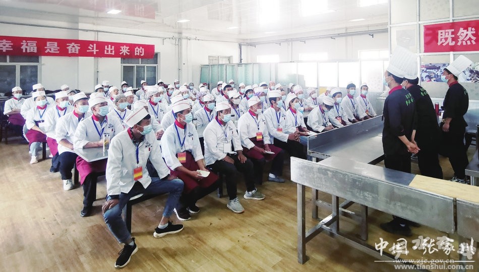 在縣職中甘肅海蘭月清真食品職業(yè)培訓(xùn)基地現(xiàn)場,記者看到一排排鍋鏟干凈整潔,理論室、配菜室、實(shí)訓(xùn)場等計(jì)劃分明,老師正在講授理論,學(xué)員們?nèi)褙炞⒌芈犞,有的用手機(jī)拍視頻,有的用筆記本記錄著做菜工序,到了實(shí)操時(shí),鍋鏟上下翻飛……
