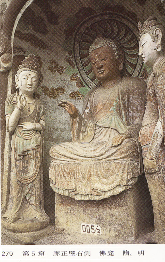 在崖面中部無(wú)富裕的情況下,隋代在崖面最高處與北周第4窟相鄰開(kāi)鑿了又一所宏偉壯觀的大窟,亦是仿木構(gòu)建筑的崖閣;三間四柱,前檐已毀,窟前部為廓,寬15.9米、高11米,正壁開(kāi)三龕。中間一龕較大,為平面馬蹄形穹窿頂深龕,內(nèi)塑一坐佛二弟子四菩薩。龕外左側(cè)一立像,戴寶冠,披甲,髭髯賁張,立牛背上。右側(cè)對(duì)稱的造像已不存,過(guò)去此像多被作天王或牛王,其實(shí)應(yīng)即摩醯首羅天,或名大自在天。在云岡石窟北魏第8窟門道右側(cè)和敦煌莫高窟西魏第285窟正壁中間龕外左側(cè)均有此乘牛天神的形象。其對(duì)側(cè)是乘金翅鳥(niǎo)的毗瑟紐天,即那羅延天。此像高4.50米,比例勻稱,英姿勃勃而又從容安詳,猶如中國(guó)西北地區(qū)少數(shù)民族武士的形象,隋代塑成之后,大約經(jīng)過(guò)唐、宋、明屢次重修。由于對(duì)側(cè)天神像早已殘失(至遲毀于唐開(kāi)元間大地震),人們依據(jù)摩醯首羅天足下臥牛,親切地稱此窟為“金蹄銀角犢兒”,后來(lái)便徑呼之為“牛兒堂”。牛是古代人民勞動(dòng)生活中的親密伴侶,匠師在塑造臥牛時(shí),顯然傾注了深厚的感情,使這一動(dòng)物形象始終受到觀者和游客的喜愛(ài)。正壁兩佛圓券形淺龕內(nèi)各塑一坐佛二菩薩,均造型飽滿厚重,雖經(jīng)重妝,仍較好地保存著隋塑的特點(diǎn)。佛像高3.20米,現(xiàn)存龕內(nèi)彩繪均為明人所作。