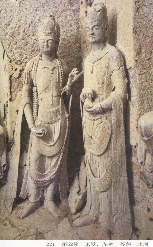 此窟位于西崖中部,平面方形,四角的攢尖頂,是麥積山現(xiàn)存北周洞窟中造像保存最好且未經(jīng)后代重修的一個洞窟。正、左、右壁各開一圓券龕,龕內(nèi)塑坐佛一身,龕外兩側(cè)脅侍菩薩各一身。前壁塑二弟子,窟外壁左側(cè)塑一力士(右側(cè)力士已失),全窟共保存塑像計十二身,正壁佛高0.92米,頭微俯,雙目低垂,結(jié)跏趺坐,作說法狀。龕外左側(cè)菩薩高1.15米,右側(cè)菩薩高1.12米,均戴三珠寶冠,頭發(fā)攏得很高,頂上再束小髻。左、或右壁龕內(nèi)坐佛皆作禪定, 分別高0.89、0.90米,左壁左、右脅侍分別高1.12、1.11米。右壁左、右脅侍分別高1.12、1.06米。前壁門左、右弟子分別高0.94、0.92米。三對脅侍菩薩的寶冠和發(fā)髻形式各有不同。六身菩薩都具有統(tǒng)一的整體造型和靈活多變的細(xì)節(jié)塑造,其肌肉豐滿、身段修長,既有北朝秀骨清像的余韻,又開隋唐豐滿圓潤之新風(fēng)。