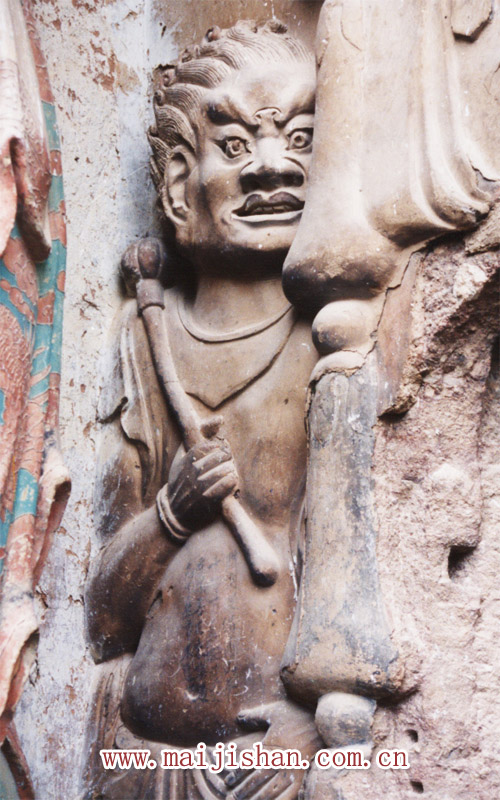 壁畫: 七個(gè)佛龕內(nèi)壁畫,全為明末清初重繪,唯諸龕外部上面的大型“薄肉塑”飛天組畫及殘存在前廊平棋上面的四幅佛傳故事畫,既為北周原作,又頗具有特色!氨∪馑堋憋w天,計(jì)五塊,約30平方米,每塊各作飛天四身,其臉部和肌體部分均為薄薄一層優(yōu)質(zhì)細(xì)泥塑出,其它如衣著、飄帶、飾物以及周圍的流云、花飾等,均彩畫而成,既生動(dòng),又極富立體感,生動(dòng)優(yōu)美,確為罕見佳作,在四幅佛傳故事畫中,尤以右側(cè)偏東的那幅騎乘人物畫最為突出。特別是那匹緩步前進(jìn)的紅馬,不論是體形動(dòng)態(tài)和神韻都繪制的維紗維肖,由于當(dāng)時(shí)的制作者,巧妙地運(yùn)用了散點(diǎn)透視和焦點(diǎn)透視的構(gòu)圖方法,又適當(dāng)考慮到人在仰視中的錯(cuò)覺關(guān)系,每當(dāng)人們從不同的位置和不同的角度來(lái)看,它都有不同的走向和動(dòng)勢(shì)。說(shuō)明我國(guó)古代畫師已掌握了透視原理及高超的技藝。