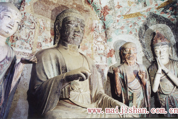 造像: 中窟塑一佛二弟子四菩薩。雖經(jīng)后代重修,仍保持著隨末到唐初的造像風(fēng)格。中窟外兩側(cè)各開一圓拱形大龕,每龕內(nèi)各塑一佛二菩薩。菩薩花蘿高冠,面目端莊秀麗,胸部半袒、雙臂外露、肌膚豐腴。但姿態(tài)服飾有別,體形微呈型扭動(dòng)曲線,婀娜多姿,后人形象地稱唐代的菩薩如宮娃,具有“豐滿圓潤(rùn)”的藝術(shù)風(fēng)格。