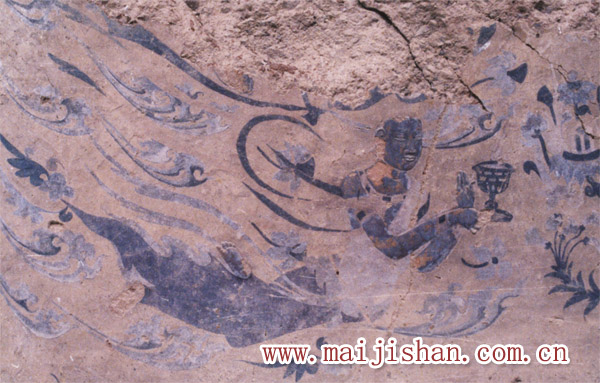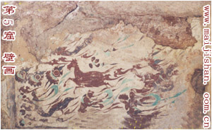 壁畫: 龕內(nèi)壁畫,全為明代重繪,僅龕外右側(cè)上方留有初唐時(shí)期所繪“西方凈土變”一塊,并有女供養(yǎng)人及侍女?dāng)?shù)十身, 身穿窄袖懸裳,長(zhǎng)裙系頸。此外,在右側(cè)身部一平棋中,正中畫馬一匹,四周有飛天圍繞,又有流云,彩蓮、佛珠襯托,可能為太子逾城的寓意之作,色彩艷麗,形象生動(dòng),亦為初唐時(shí)期代表作品之一。