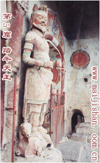 中龕外右側(cè)塑一天王像,身穿鎧甲,兩眼圓睜,神情威嚴(yán),腳采一臥的小牛犢背上,臥牛昂首屈膝,掙扎欲起,姿態(tài)極其生動(dòng)。這就是《玉堂閑話》中所謂的“金蹄銀角兒”。該窟因此也稱“牛兒堂”。民間關(guān)于小牛的傳說也十分動(dòng)人。相傳,牛兒堂的這尊天王,本該站在他腳下的蓮臺(tái)上。但在窟廊上靜臥的小牛犢是一頭神牛,它力大無比,要是吼叫一聲,就會(huì)天崩地裂,山體倒塌,為眾生常來無窮的災(zāi)難。牛犢的這種本性,引起天王的注意與提防。一天,天王發(fā)現(xiàn)牛犢伸長(zhǎng)脖子,抖動(dòng)四啼要聳起身來活動(dòng)一番。天王生怕牛犢的這一舉動(dòng)會(huì)給眾生降下大禍,為保住山體便縱身一躍,雙腳穩(wěn)穩(wěn)踏在牛背之上,牛犢幾番掙扎未能躍起,一場(chǎng)眼看要發(fā)生的災(zāi)難免除了。直到今天,天王還踏著這頭神牛,似乎還不忘保護(hù)人們的安全。美麗的傳說,反映人們對(duì)安寧、和平、幸福生活的希望與祈求。