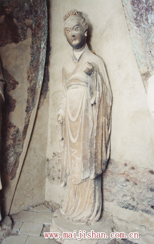 原造像全毀,僅存束帛佛座和背光?邇(nèi)正壁塑交腳彌勒菩薩一尊,內(nèi)著僧祗支外穿通肩大衣,結(jié)跏跌坐。左右各立中年女性供養(yǎng)人一尊,高髻花冠橢圓臉。眉彎長(zhǎng)與鼻相通,眼角上翹,小嘴,著當(dāng)時(shí)世俗女式服裝,外著交領(lǐng)長(zhǎng)衣,右邊腰中系帶,長(zhǎng)裙蓋足露腳尖,右手握拳上舉、左手下垂、衣紋線條自然流暢、身材窈窕、俏麗潤(rùn)秀、個(gè)性鮮明、為當(dāng)時(shí)上層社會(huì)年輕貴婦的真實(shí)寫照。左壁菩薩、頭頂方巾、額有毫光、袒胸、內(nèi)穿斜領(lǐng)小衣,外著開(kāi)領(lǐng)長(zhǎng)衫、兩手重疊于腹前、手心向上、作觀音相。右壁菩薩頂束高髻,面形與左菩薩相同。左、右壁菩薩面目端莊秀麗、儀態(tài)典雅、肌膚細(xì)膩、怡然自得、溫婉可親,具有鮮明的性格特征。