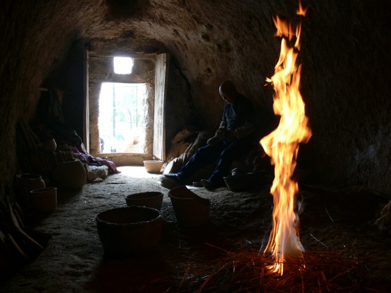 火是文明的象征。5月16日傍晚,大地灣原始復(fù)原村落的草地上,一堆堆篝火熊熊燃起,一群群披頭散發(fā)、樹葉蔽體的男男女女圍站在一起戲耍嬉鬧,突起的火苗映紅了他們的臉膛,畢畢剝剝的聲響平添了幾分幽趣,那懸著的獵物被燒烤得流油溢香……這是攝制組組織天水市藝術(shù)學(xué)校12名學(xué)生演繹再現(xiàn)大地灣先民古樸而浪漫的生活場景。原始先民對(duì)火情有獨(dú)鐘,他們?cè)谥斓姆课萸疤枚季蛴幸粋(gè)火坑,它既可以御寒保暖,又可以防范野獸的侵襲。在火坑的后端還鑿有一個(gè)小洞穴,專門用于保存火種。