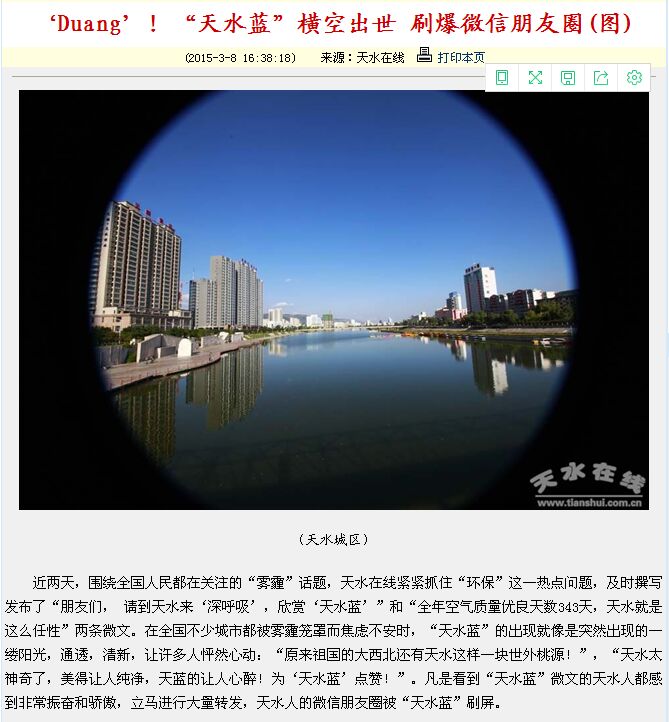 ▲2015年5月26日,在2015(乙未)年公祭中華人文始祖伏羲大典暨第二十六屆中國天水伏羲文化旅游節(jié)召開前夕,天水市人民政府櫥窗推出“天水藍(lán)”專題。該專題重點(diǎn)報(bào)道天水市開展環(huán)境保護(hù)專項(xiàng)行動(dòng)成果,展示天水良好的生態(tài)環(huán)境。