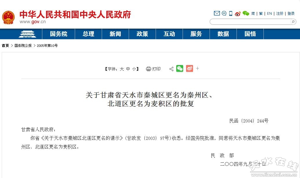 天水在線2005年1月1日報道 今天是2005年的第一天,也是一個全市340萬人民尤其是110萬秦州、麥積兩區(qū)人民共同銘記的日子,從今天起,經(jīng)國務院批準,秦城、北道兩區(qū)正式更名為秦州區(qū)、麥積區(qū),兩區(qū)更名的名稱、印章于今天正式啟用,兩區(qū)歷史從此翻開新的一頁。