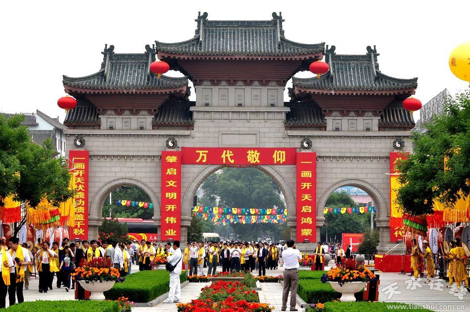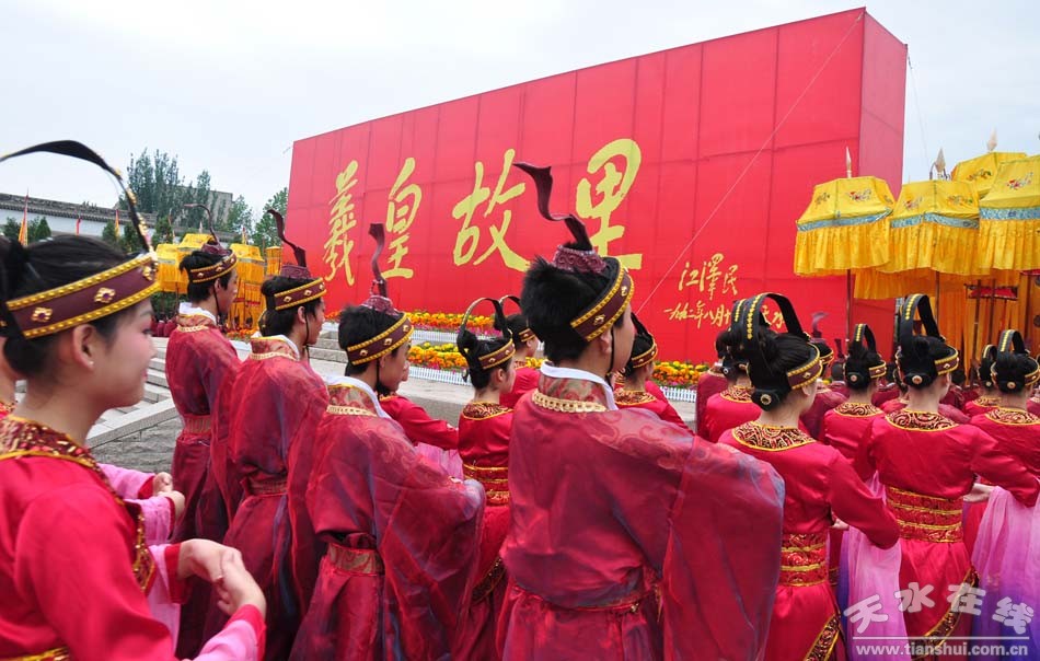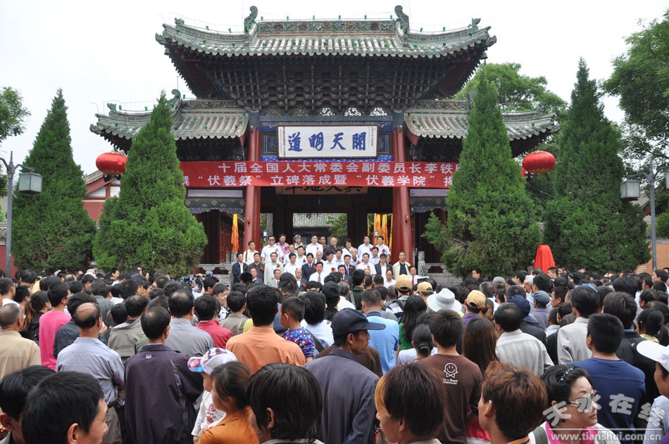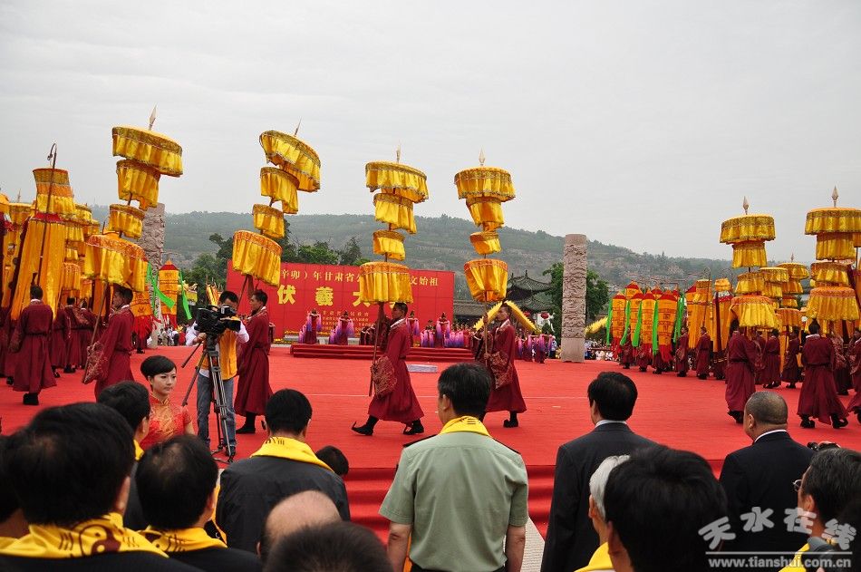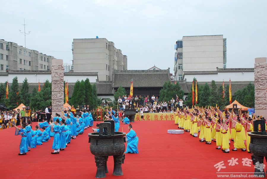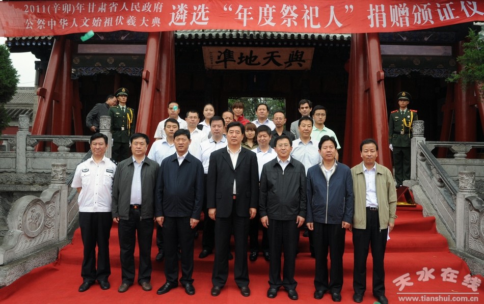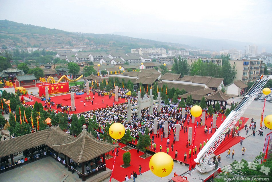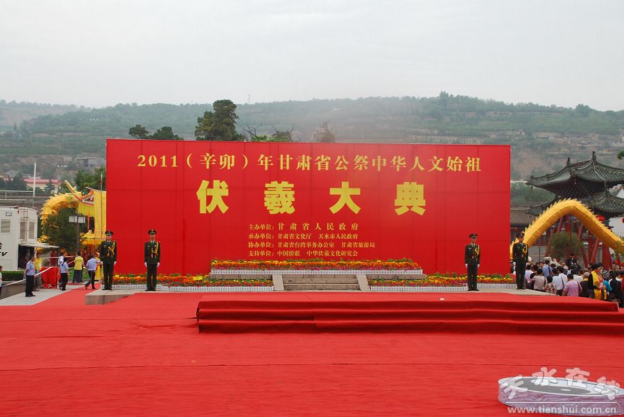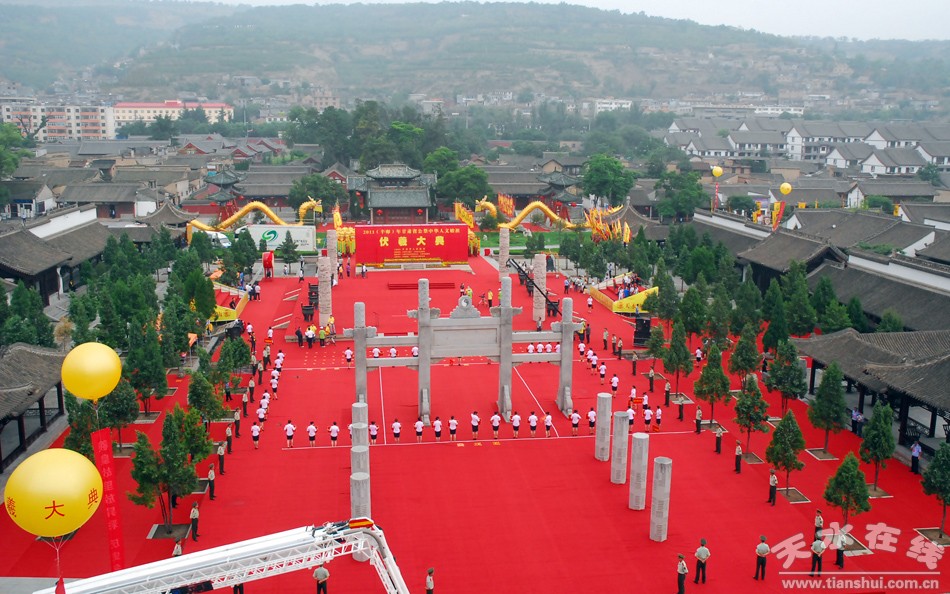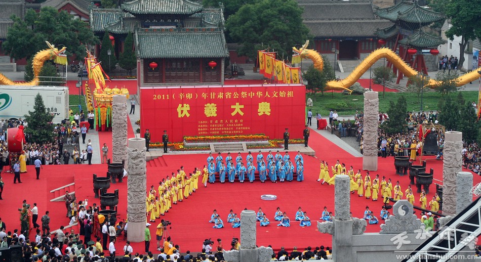 2011年6月22日上午,天水市伏羲祭祀廣場(chǎng)古樂(lè)悠悠,氣勢(shì)恢宏;伏羲廟內(nèi)古柏掩映,莊嚴(yán)肅穆。由甘肅省人民政府主辦,天水市人民政府、甘肅省文化廳承辦的2011(辛卯)年甘肅省公祭中華人文始祖太昊伏羲大典在這里隆重舉行。海內(nèi)外中華兒女近萬(wàn)人匯聚一起,傳承中華文明,公祭人文始祖,表達(dá)對(duì)太昊伏羲的虔誠(chéng)和敬仰。