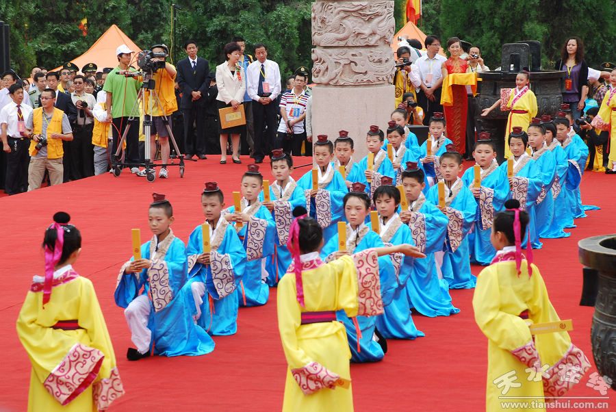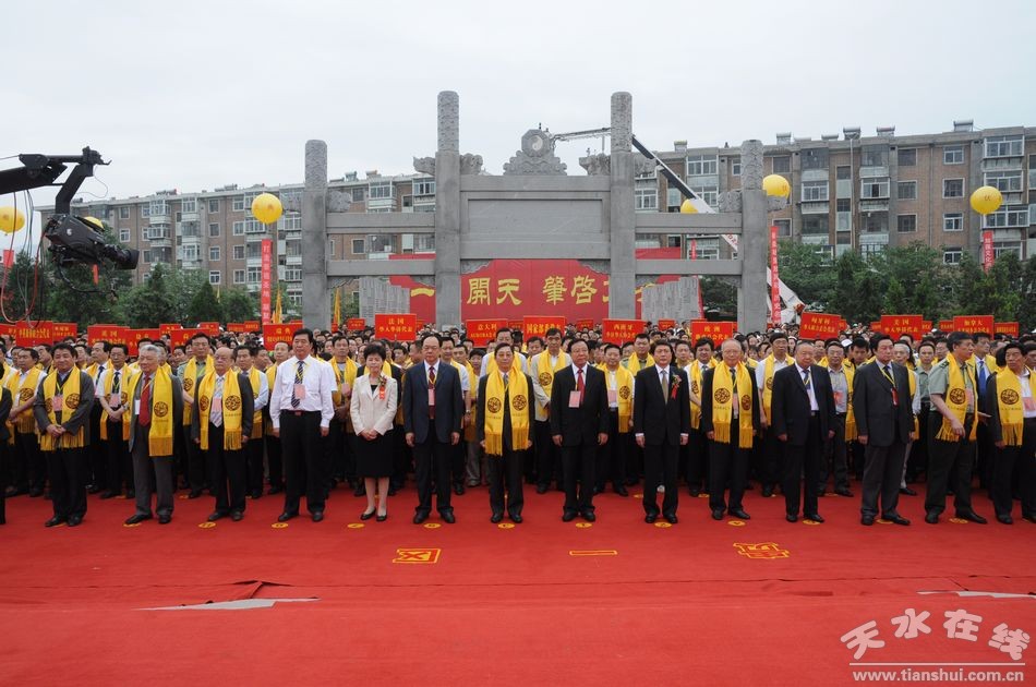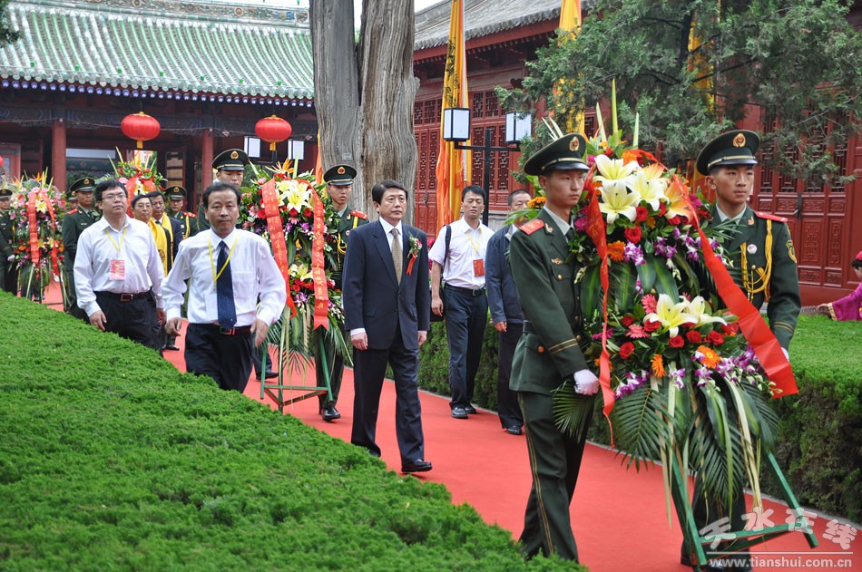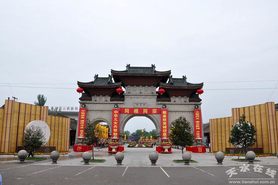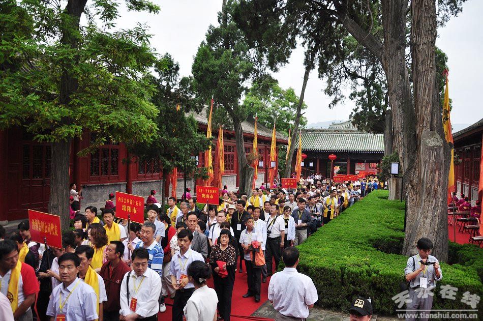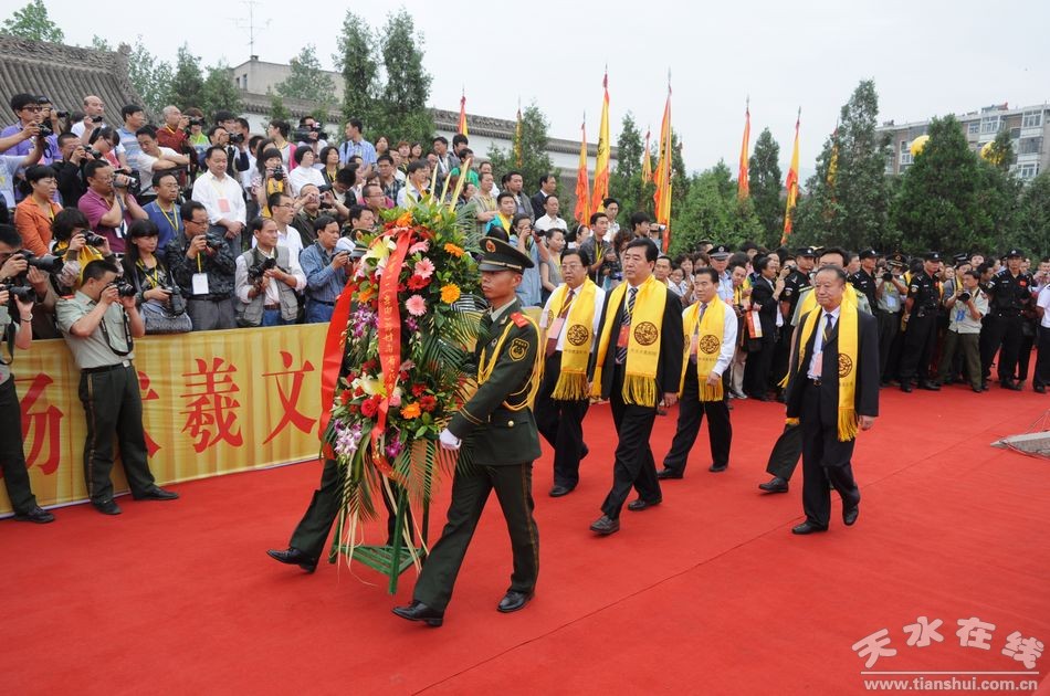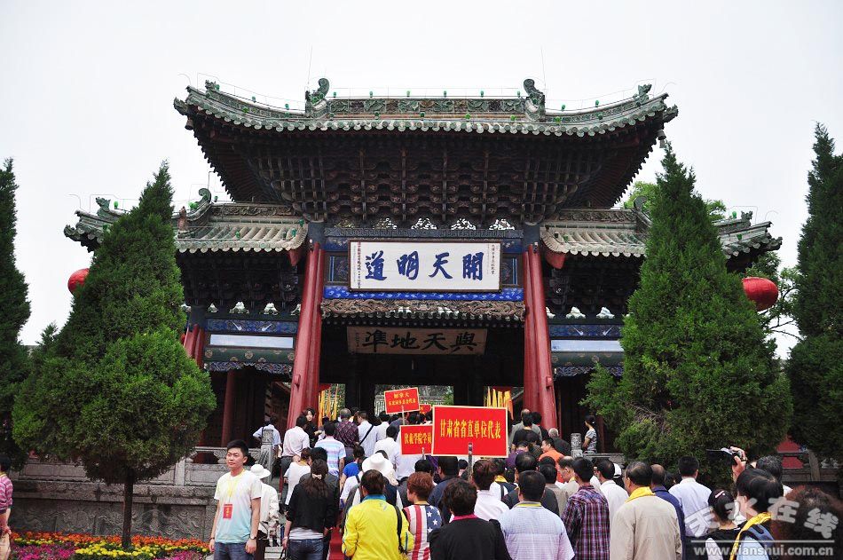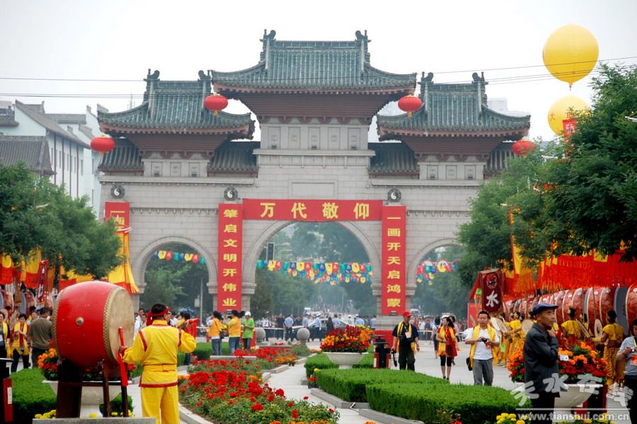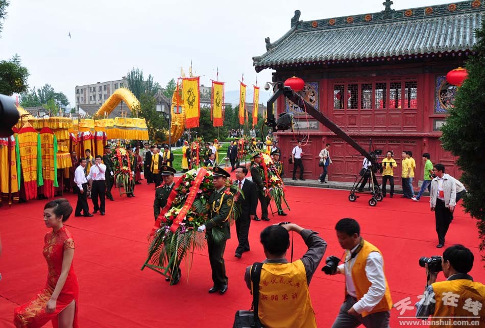 2011年6月22日上午,天水市伏羲祭祀廣場(chǎng)古樂(lè)悠悠,氣勢(shì)恢宏;伏羲廟內(nèi)古柏掩映,莊嚴(yán)肅穆。由甘肅省人民政府主辦,天水市人民政府、甘肅省文化廳承辦的2011(辛卯)年甘肅省公祭中華人文始祖太昊伏羲大典在這里隆重舉行。海內(nèi)外中華兒女近萬(wàn)人匯聚一起,傳承中華文明,公祭人文始祖,表達(dá)對(duì)太昊伏羲的虔誠(chéng)和敬仰。