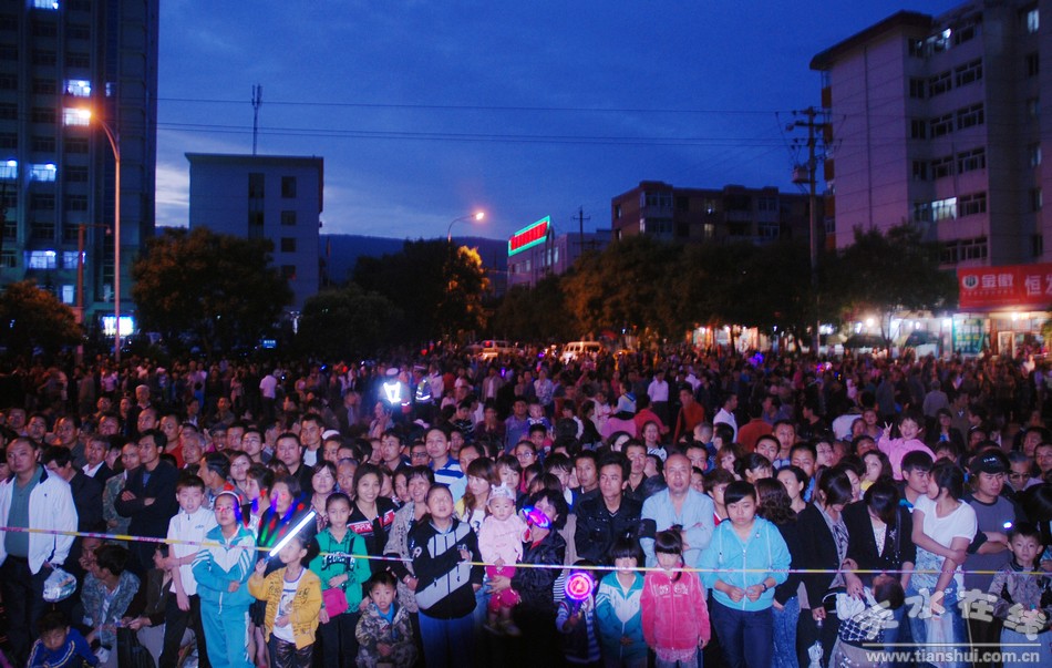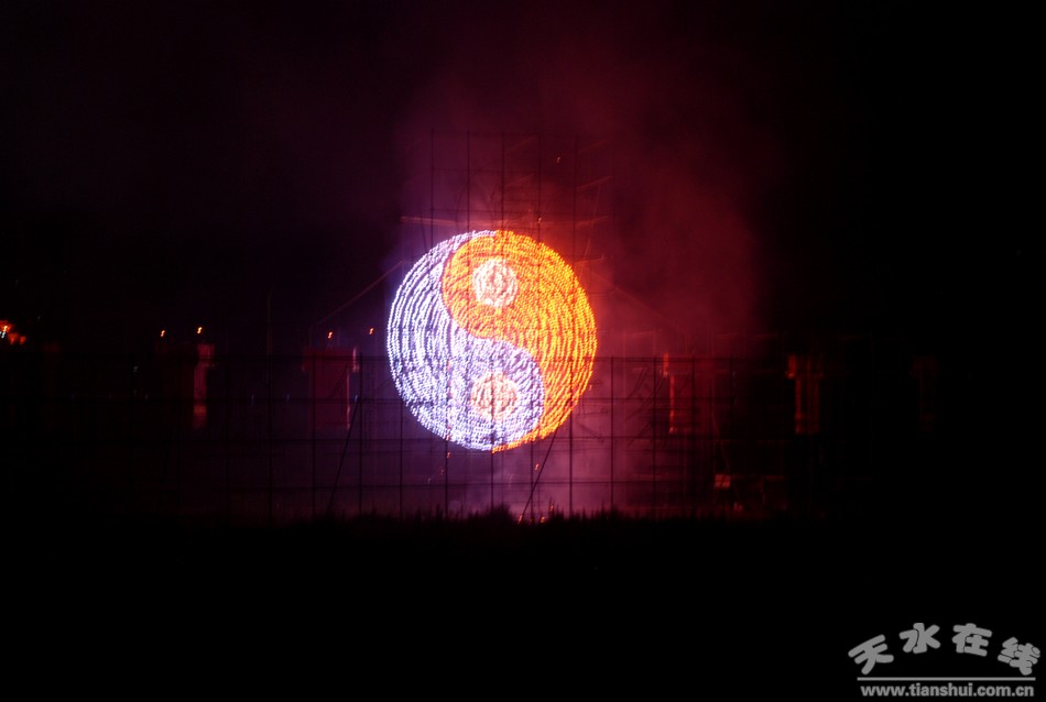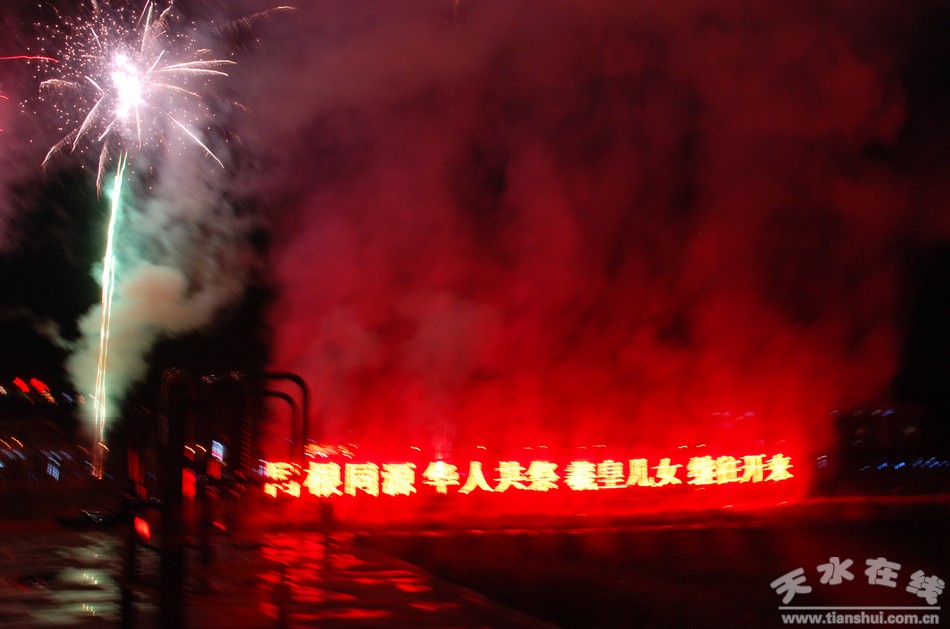 ▲晚九點(diǎn)整,音樂(lè)焰火晚會(huì)正式拉開(kāi)了序幕。綠牡丹、黃千輪、金波藍(lán)、色連珠花以及各式中空禮花,穿插特效花束、燭光、虎尾等組合電腦特技表演的效果,活力四射、青春律動(dòng)、把和諧之美展示無(wú)余。絢爛的焰火爭(zhēng)奇斗艷,相互輝映,映亮了整個(gè)秦州夜空。